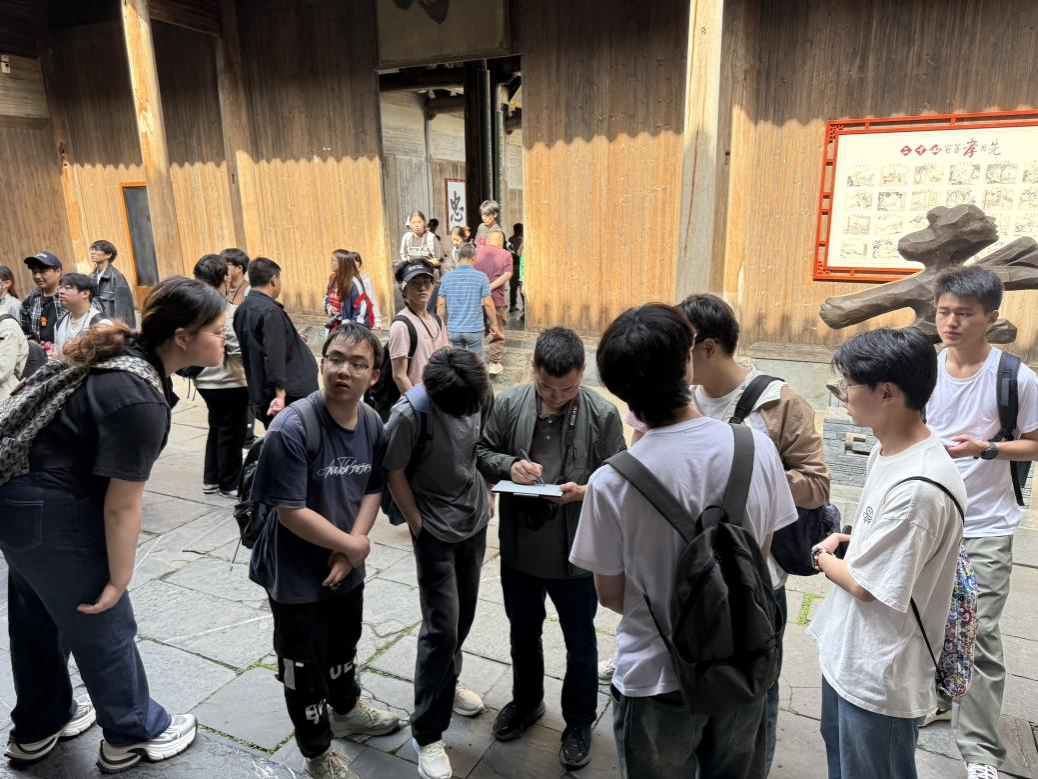 晨光中,胡氏宗祠敬爱堂的巍峨门楼映入眼帘。同学们手持测绘仪,穿梭于三进院落之间,在老师的指导下精准记录每一处梁架尺寸与空间比例。“面阔五间、进深九檩的规制,暗含‘九五之尊’的礼制思想。”追慕堂内,同学们仰首凝视檐下斗拱,彩绘的“锦纹方心”在晨光中流转生辉,笔尖在速写本上沙沙作响,将繁复的纹样转化为设计语言的初稿。
