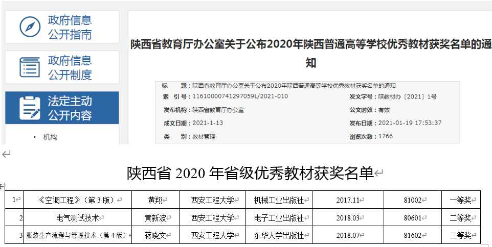 近日,陕西省教育厅印发《关于公布2020年陕西普通高等学校优秀教材获奖名单的通知》(陕教高办〔2021〕1号),kaiyun开云官方网站黄翔教授主编的《空调工程》(第3版)获得省级优秀教材一等奖。