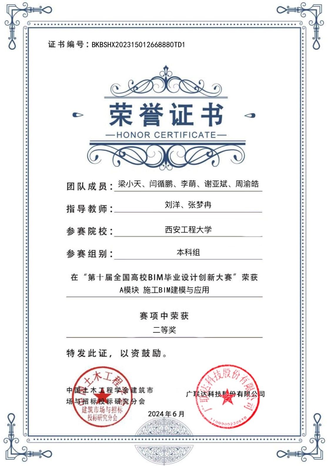 近日,开云学子在由中国土木工程学会建筑市场与招标投标研究分会、广联达科技股份有限公司联合主办的第十届全国高校BIM毕业设计创新大赛中喜获佳绩。本次比赛共吸引全国665所高等学校、12000余支团队、超过70000名师生参赛,全国总决赛共提交作品3984份,规模再创新高。经过激烈角逐,由开云土木工程专业21级学生梁小天、李萌、闫循鹏和22级学生周瑜浩、谢亚斌组成的鲜橙一队,在指导老师刘洋和张梦冉的指导下,荣获A模块“施工BIM建模与应用”赛项全国二等奖。