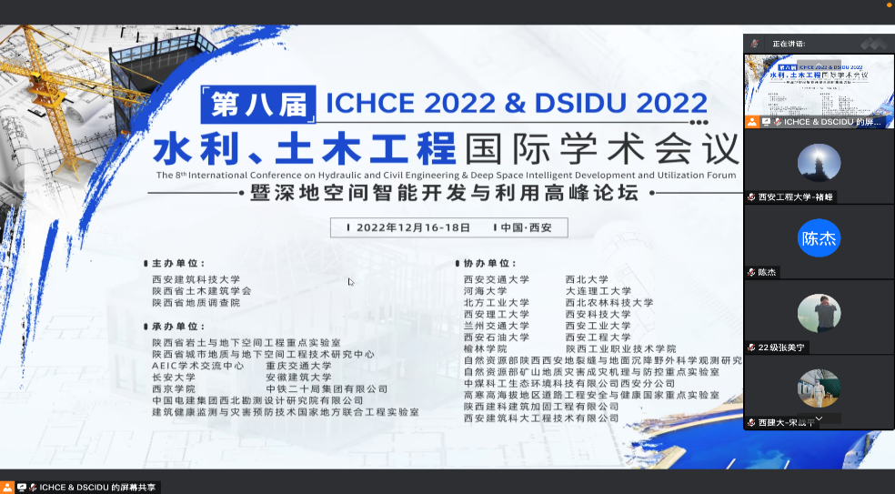2022年12月17日、18日,由西安建筑科技大学主办的第八届水利、土木工程国际学术会议暨深地空间智能开发与利用高峰论坛(ICHCE 2022 & DSIDU 2022)在线上举行,kaiyun开云官方网站土木工程系褚峰副教授受邀主持会议分会场,学院土木工程专业的部分研究生、本科生参加了本次会议。