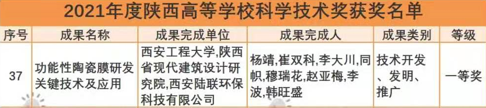 2021年1月29日,2021年度陕西高等学校科学技术奖评审结果出炉,开云杨靖教授、李波老师申报的《功能性陶瓷膜研发关键技术及应用》获一等奖。