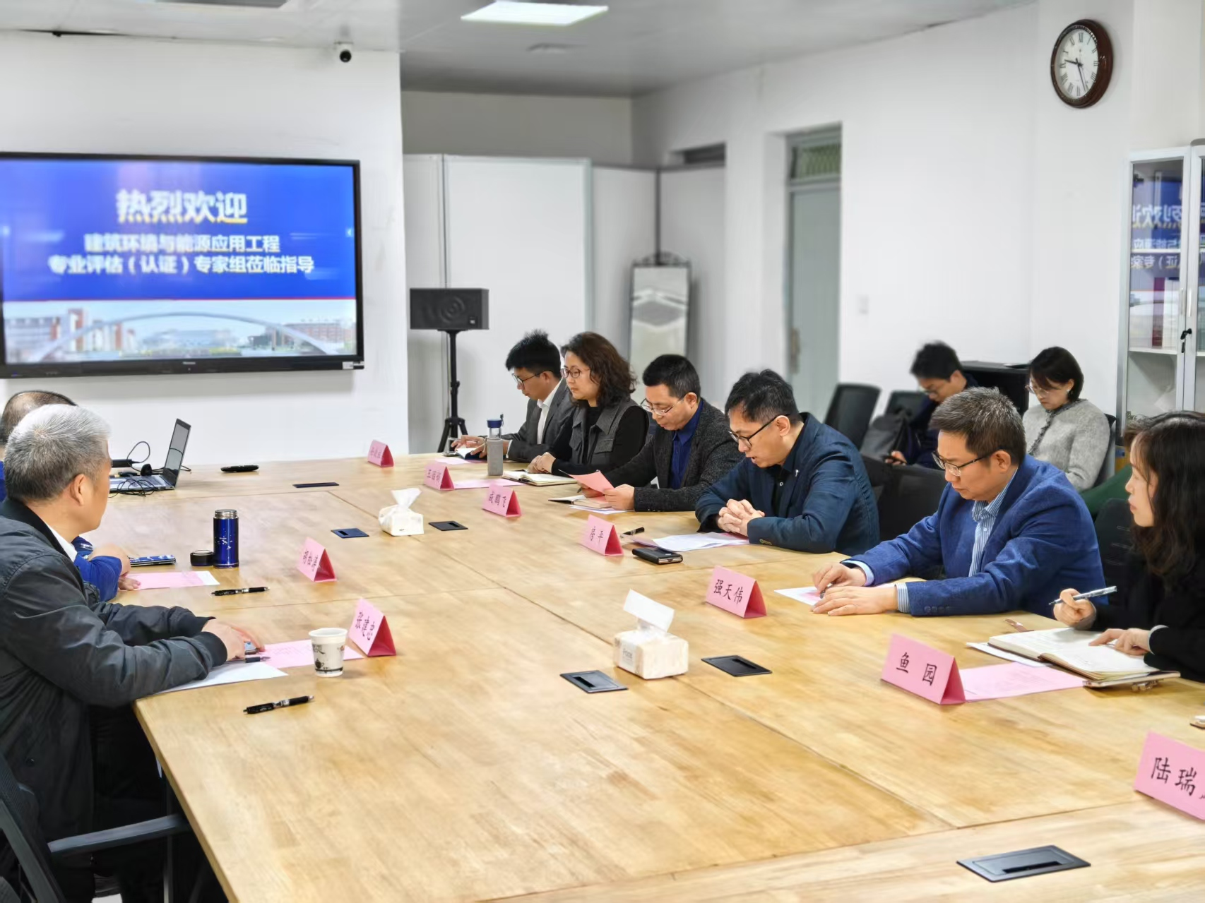 评估(认证)会议前,学院党委书记陈宣、副院长房平、基建处副处长强天伟和评估督导专家组一行进行了亲切友好的座谈。陈宣谈到,学院始终以“服务双碳战略、引领健康人居”为目标,聚焦绿色建筑技术、低碳能源系统,在学科建设、专业建设、人才培养、团队建设、科研攻关和社会服务等方面取得阶段性成果,面对行业转型升级与国家战略需求,学院仍面临诸多挑战。今天的评估既是一次体检,更是一场赋能提升的契机。学院将以此次中期检查为新的起点,以评促建、以评促改、以评促强,全力推动建环专业高质量发展!