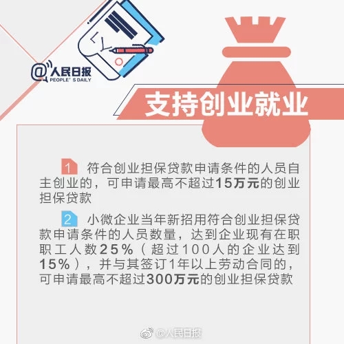 ①符合条件的个人和小微企业,可分别申请最高不超15万和300万创业担保贷款;②支持就业压力较大地区为失业人员自主创业免费提供经营场地;③将就业见习补贴范围扩展至16—24岁失业青年!!