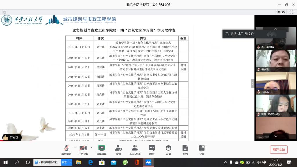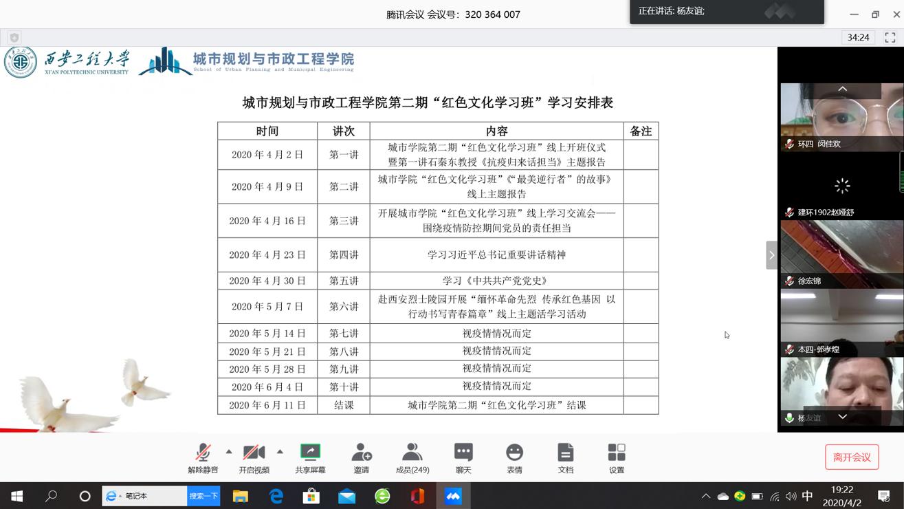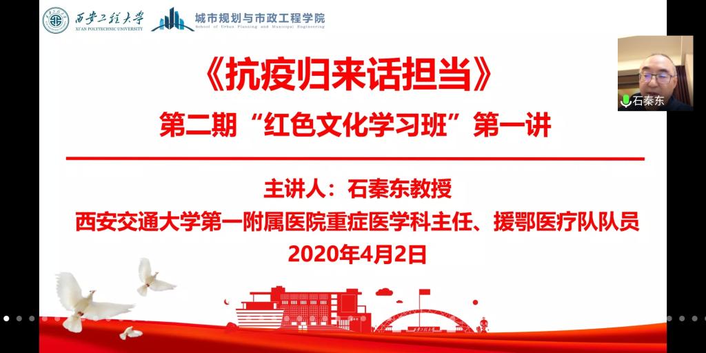 为加强大学生党员的理想信念教育,传承红色基因,锻造红色校园文化,培养大学生党员的责任与担当,落实立德树人根本任务。2020年4月2日晚19时,kaiyun开云官方网站第二期“红色文化学习班”线上开班仪式顺利举行,并邀请西安交通大学第一附属医院、援鄂医疗队队员石秦东教授做第一讲。参加开班仪式的有校党委组织部副部长刘俊富、校党委宣传部副部长戴新、学院党委书记杨友谊、学工办主任凌旭、学院全体支部书记和辅导员、第二期学习班学员、学院全体学生党员及团学干部。会议由学院党委副书记袁群主持。