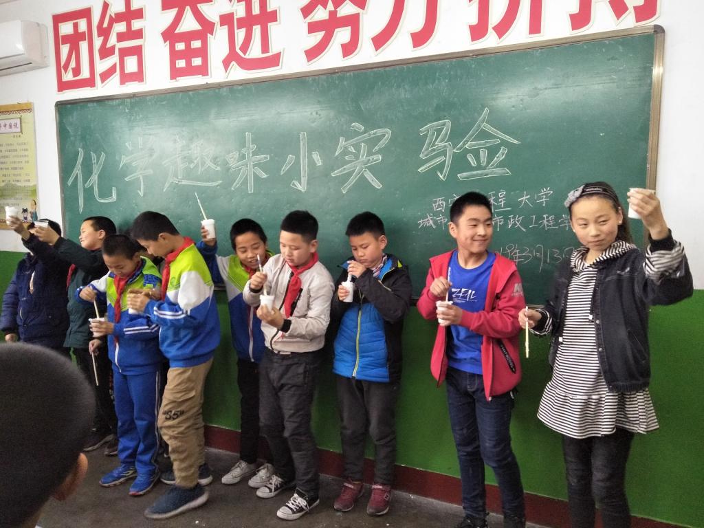 下午四时许,志愿者们来到西安博睿实验学校。在与同学们进行了简单的交流和互动之后,志愿者们通过做“牛奶可乐碰撞实验”和“人体穿过A4纸游戏”活跃了现场气氛。为提高学生们的兴趣,志愿者还向同学们展示并让学生亲手实践了人造雪的小实验。通过两个小时的互动与讲解,学生们接触了些许生活中的化学奥秘,开阔了他们的视野,相信这会为他们之后的学习奠定一些兴趣基础。