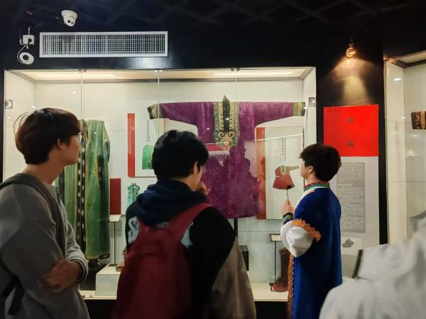 乌孜别克族讲解员城市学院赵志聪同学,接引参观学生,引导学生参观了蒙古族展柜、乌孜别克族展柜,以及重点展品。如:凤穿牡丹、蟒袍、印花模具等等。
