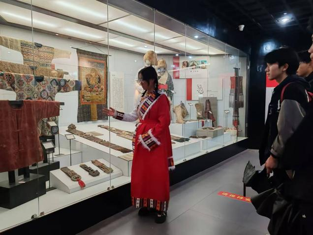 接着,在藏族服饰的展柜。藏族讲解员电信学院乔羊措吉和人文学院德吉曲宗同学分别向大家介绍了藏族的文化历史、服装特色、装饰品和佛教用品。