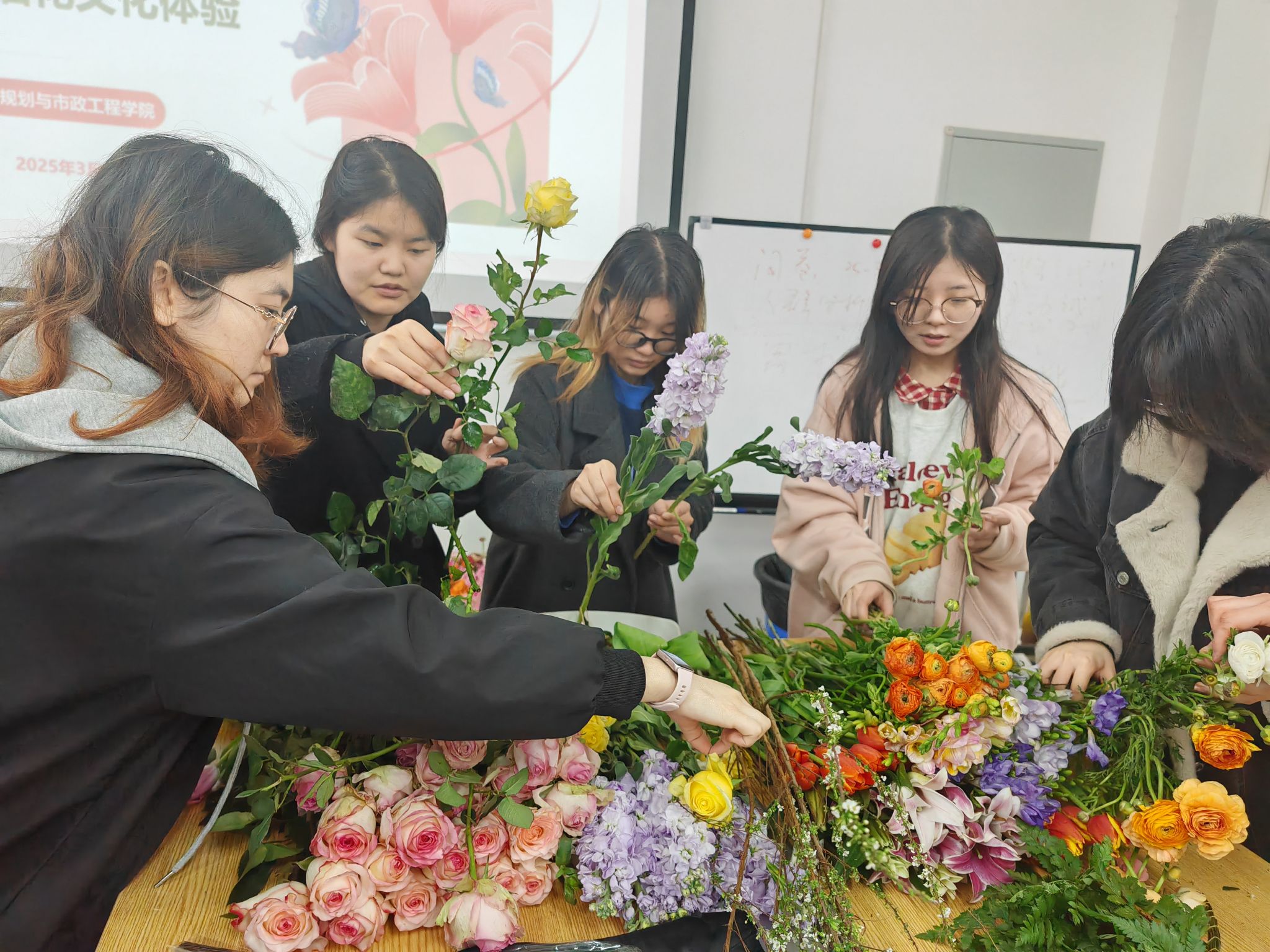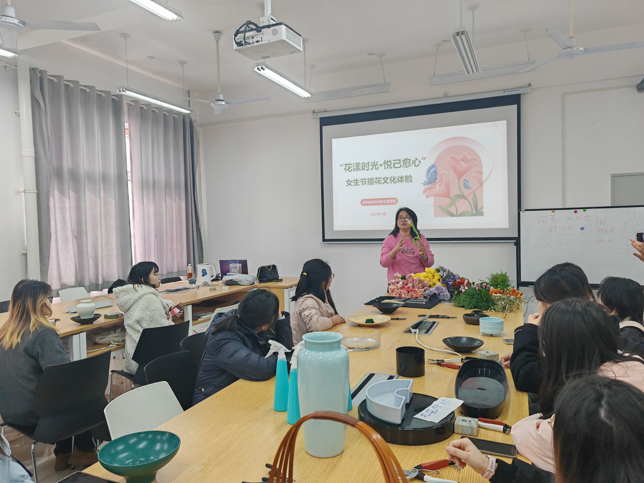 活动当天,学院邀请景观系三全育人导师团郑君芝副教授向二十余名女同学讲授了插花的基本技巧与艺术表达。从花材的选择到色系的搭配,从花器的挑选到组合设计,同学们在动手实践中逐步提升了自己的插花水平。郑君芝副教授不仅为大家讲解了插花的历史与文化,还带领大家感受了东方式插花的自然之美;通过理论与实践的结合,同学们不仅掌握了插花的技巧,还深入了解了插花艺术的多样魅力。