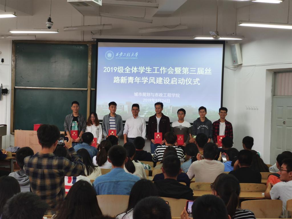 最后,陆瑞成宣布第三届丝路新青年学风建设启动。与会老师为2019级助理班主任、军训先进个人、军训优秀通讯员颁发荣誉证书,并希望19级新生能在各班班助的帮助下要尽快地适应大学学习生活环境,在大学生活中快速成长。