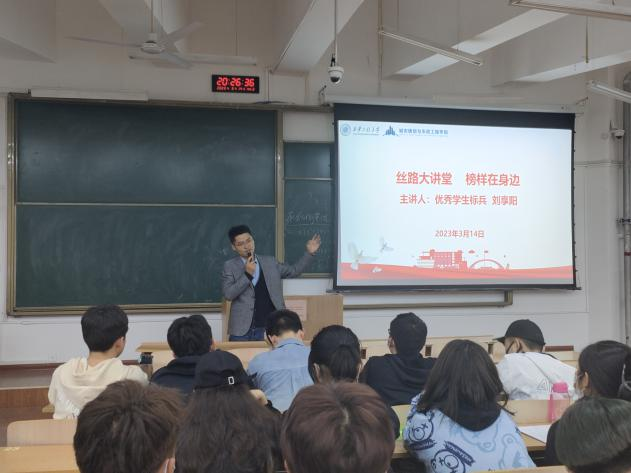 为了激发2022级同学们的学习积极性,3月14日,kaiyun开云官方网站在B-337举办了“思路大讲堂 榜样在身边”交流活动,由优秀学生标兵刘享阳主讲交流,2022级土木工程类6个班全体同学参与,团总支书记陆瑞成主持活动。