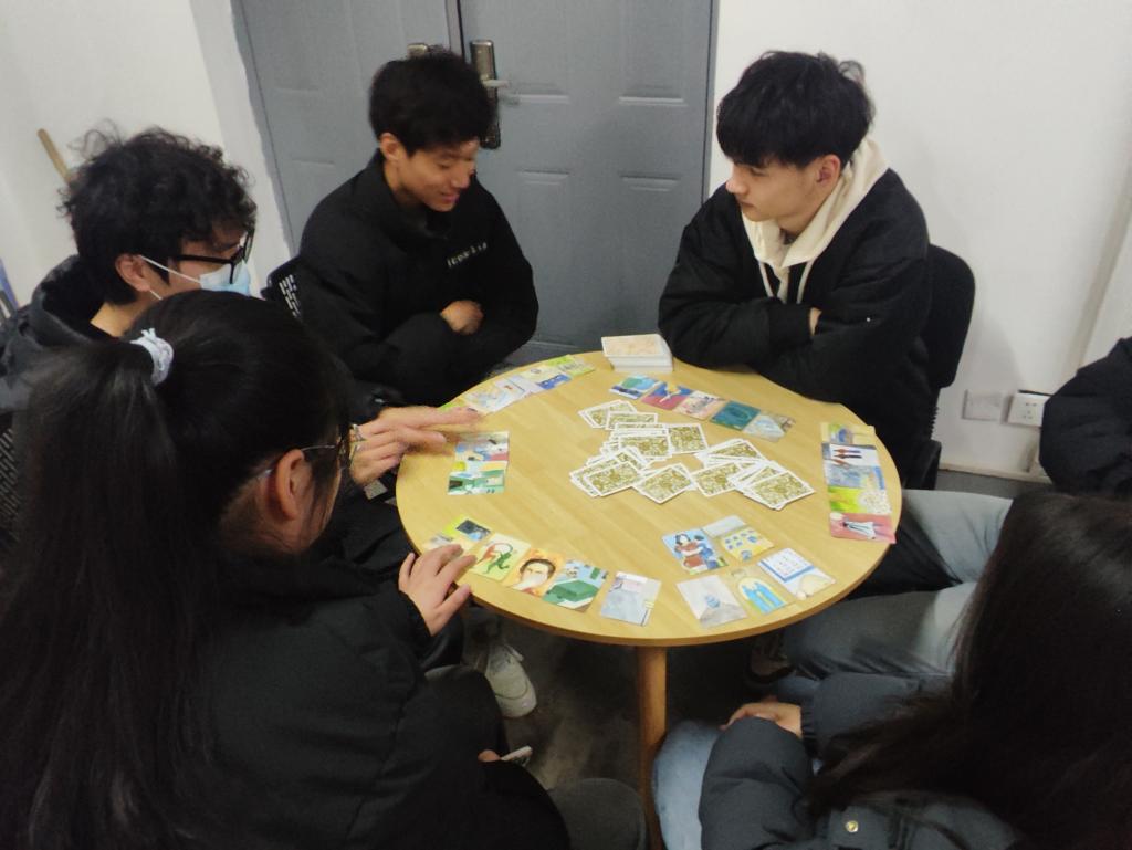 团辅活动分为三个环节。第一个环节,通过随机抽取一张图片卡片,参与者根据卡片上的内容,结合自身经历进行联想和描述,从而启发对个体内心深层的认识。第二个环节,通过小组内部商定抽取15张文字卡,组员按照逆时针顺序盲抽一张图片卡片并与文字卡进行对应,向组员表达自己为什么对应的原因,进一步挖掘了情感和体验的深度,通过独特的组合呈现出每个人独特的内在世界。最后一个环节,每位组员通过随机抽取5张卡片,按照“过去、现在、将来”的顺序进行排序,并讨论排序的原因。这个环节旨在促使参与者回顾过去的经历、展望未来的发展,以及深入思考当前的学习生活状态。通过组员彼此讨论,每个参与者能够更清晰地认识自己的成长轨迹和未来期望,同时也加深了团队成员之间的理解和交流。